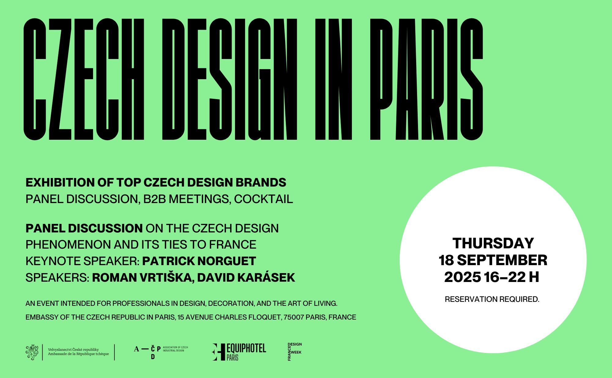 A business and networking event bringing together Czech and French design professionals will take place on 18 September 2025 at the Embassy of the Czech Republic in Paris. The highlight of the afternoon will be a panel discussion featuring leading figures of European design, including French designer Patrick Norguet, Roman Vrtiška of the renowned Czech design duo Vrtiška & Žák, and David Karásek, prominent Czech designer of urban furniture and founder of mmcité.
