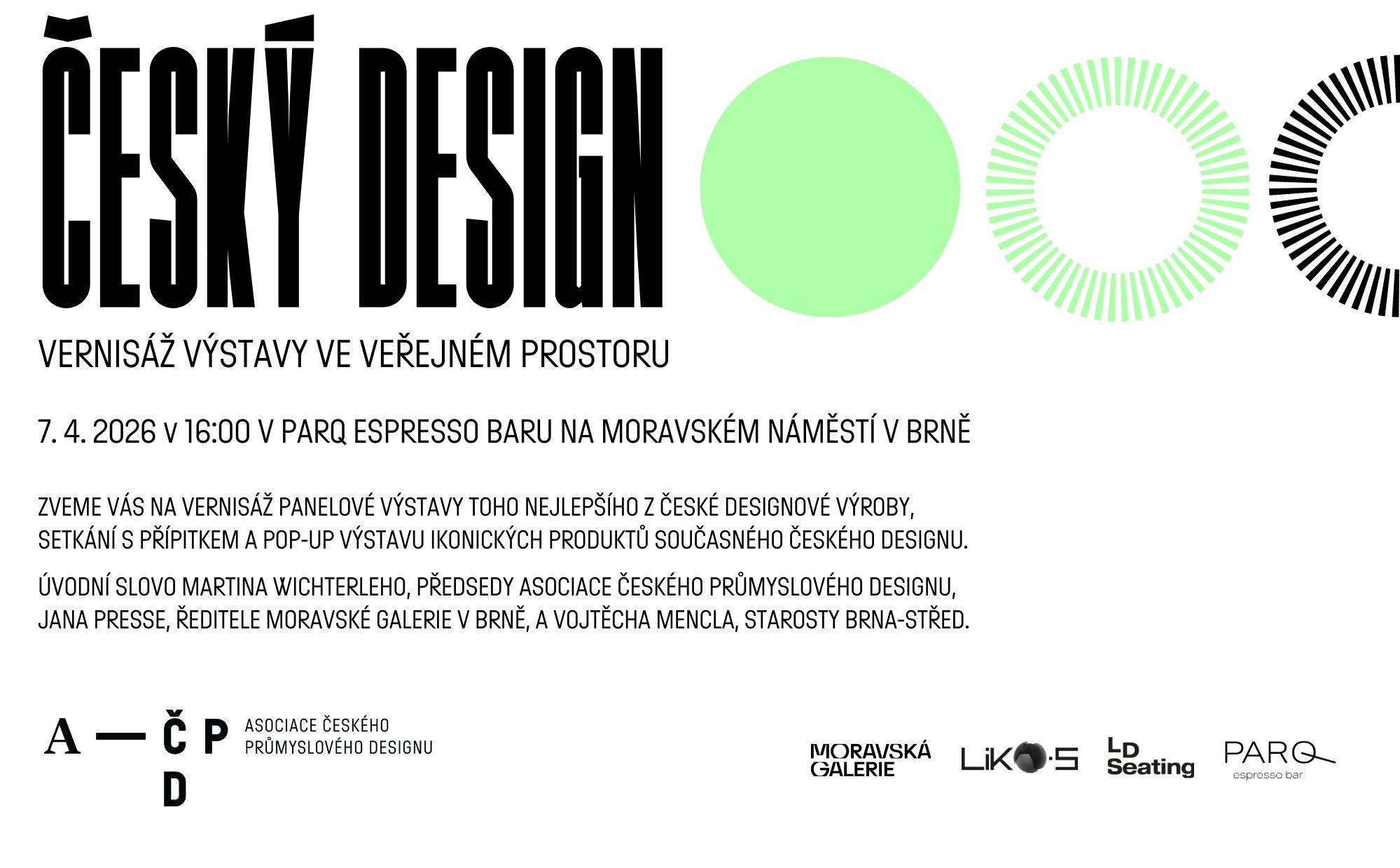 To nejlepší ze současného českého designu se představí v Brně. Vernisáž výstavy ve veřejném prostoru spojená s pop-up výstavou ikonických produktů současného českého designu se uskuteční 7. dubna od 16:00 v prostoru PARQ espresso baru. Putovní panelová výstava Český design, za níž stojí Asociace českého průmyslového designu, bude od 1. do 30. dubna 2026 k vidění ve veřejném prostoru Moravského náměstí. Hlavním partnerem brněnské zastávky je Moravská galerie v Brně.